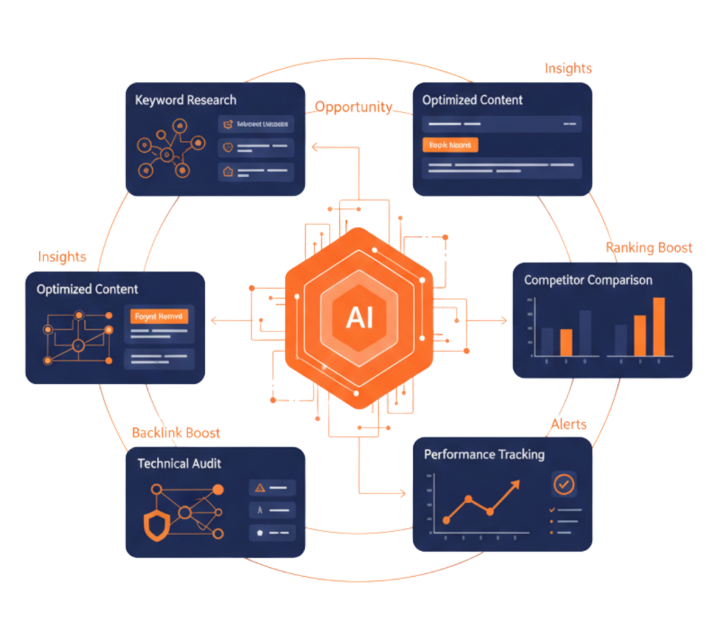 Unlike traditional SEO methods that rely heavily on manual effort and large teams, AI-driven SEO automates time-consuming tasks and enhances efficiency at scale. Whether you’re a startup or an enterprise, these solutions enable you to optimize content, improve site structure, and execute data-backed strategies with minimal resources. The result is a more agile, intelligent, and impactful SEO process—designed to increase visibility, traffic, and long-term organic growth.