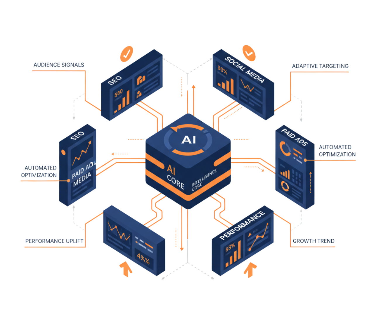We enhance digital marketing with AI-driven intelligence that strengthens strategy and execution. From SEO and paid campaigns to social media and performance marketing, our augmented approach blends data, automation, and human insight to optimize targeting, improve ROI, and drive measurable growth across every channel.