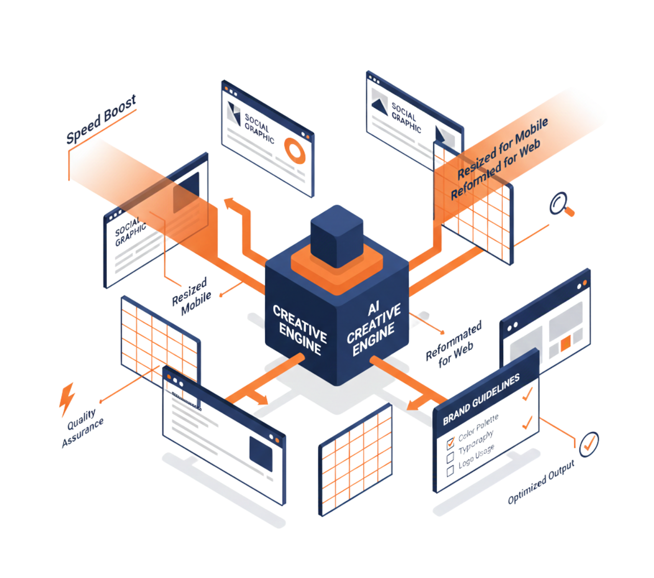 Automate the creation of high-impact designs, visuals, and brand creatives using AI-powered workflows. From social media graphics and ad creatives to banners and digital assets, we ensure consistent branding, faster production, and scalable creativity—helping brands deliver compelling visuals at speed.